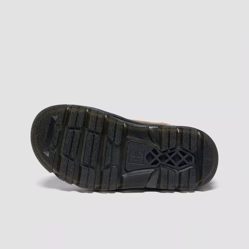 La suela luce los distintivos sellos de Dr. Martens, con un agresivo patrón de tracción, acanalado pronunciado y el inconfundible pespunte amarillo que caracteriza a la marca.
