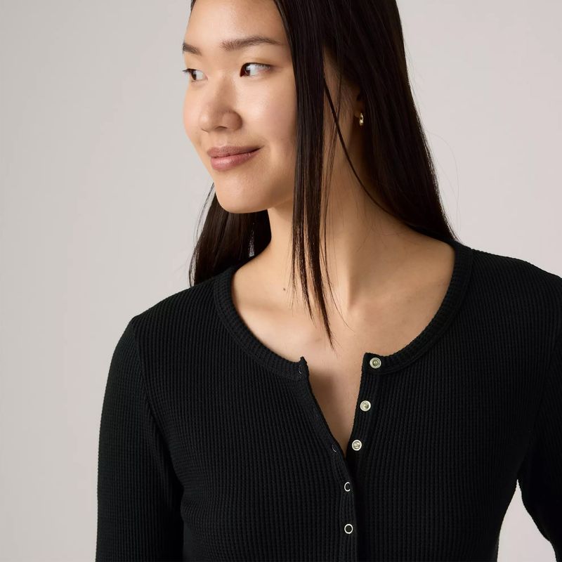 Esta camiseta Waffle Henley combina estilo retro y comodidad moderna: cuenta con cuello de pico, tapeta de tres botones, fit estrecho y cropped, y está confeccionada en tejido de punto waffle suave y texturizado.