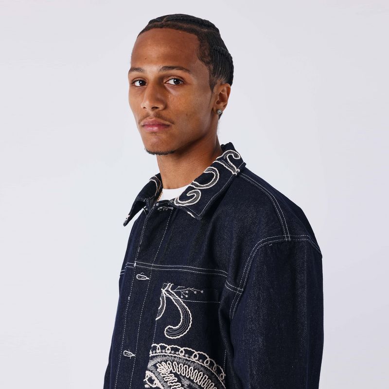 Camisa boxy de Project X Paris con corte holgado y cuello clásico de camisa. Manga larga con puños ajustables y apertura frontal con botones metálicos. Presenta costuras contrastantes, logo bordado en el pecho y detalles de bandana en el bolsillo frontal y el cuello que aportan un toque distintivo y moderno.
