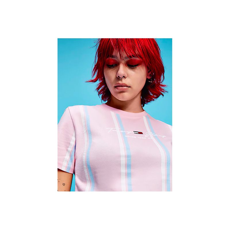 Esta camiseta de Tommy de rayas en algodón orgánico en tonos pastel cuenta con un favorecedor corte cropped entallado y vistosos detalles distintivos.